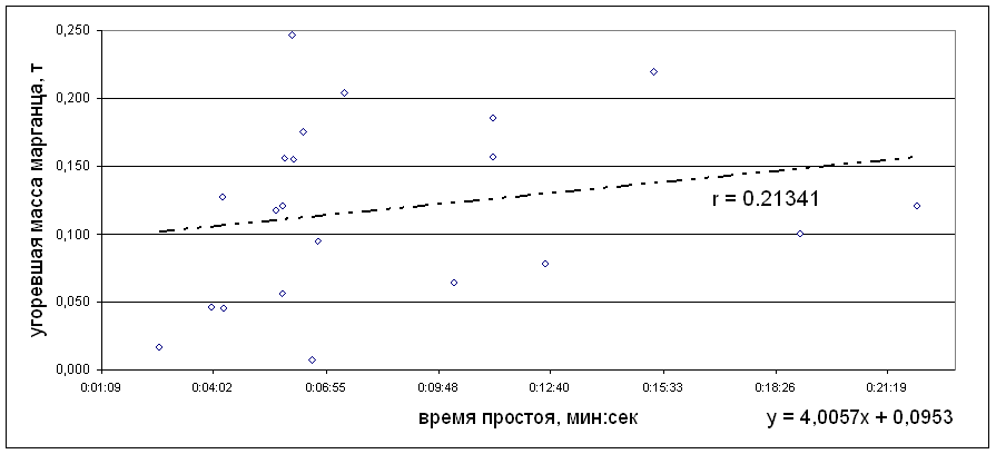 Рисунок 5.33 - Зависимость угоревшей массы марганца, т, от времени простоя, мин:сек