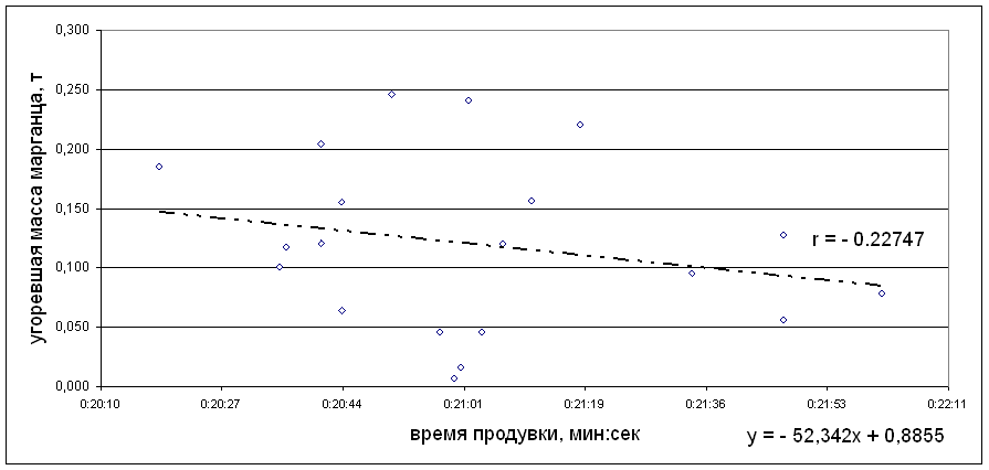 Рисунок 5.37 - Зависимость угоревшей массы марганца, т, от времени продувки, мин:сек