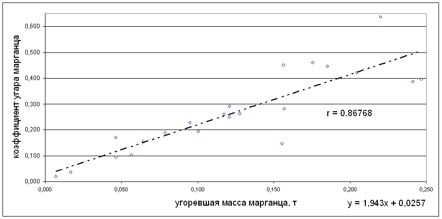 Рисунок 5.39 - Зависимость коэффициента угара марганца от угоревшей массы марганца, т