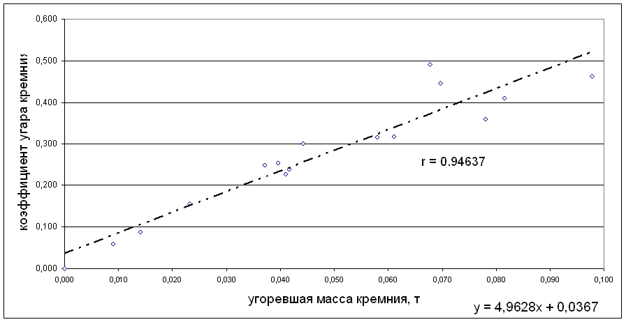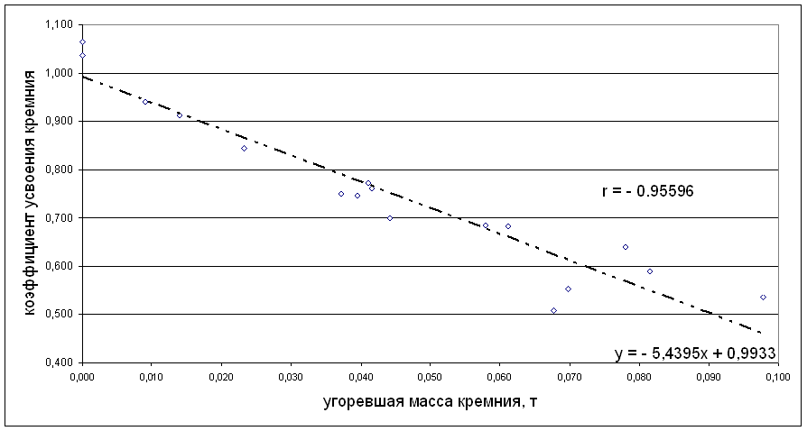 Рисунок 5.40 - Зависимость коэффициента угара кремния от угоревшей массы кремния, т