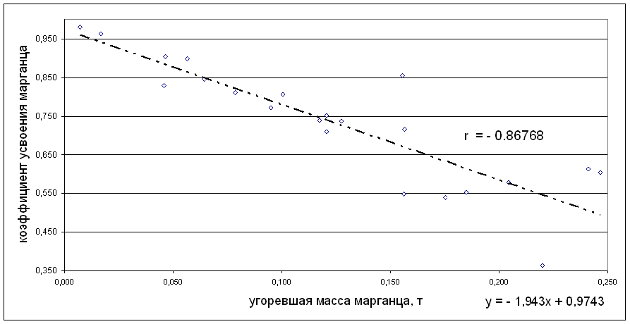 Рисунок5.41 - Зависимость коэффициента усвоения марганца от угоревшей массы марганца, т