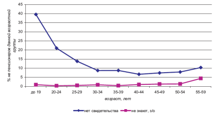 СПУ предусматривает обязательное открытие индивидуального счета каждого застрахованного лица с фиксацией всех предусмотренных законом страховых взносов работника, а также выдачу каждому застрахованному пенсионного удостоверения застрахованного лица. СПУ является необходимым административным элементом пенсионного страхования, и ее формирование заняло несколько лет. В итоге в стране была создана единая уникальная система, которая в принципе должна была охватить все население, занятое по трудовым договорам и договорам гражданско-правового характера. Так это или нет, помогают оценить некоторые выборочные обследования населения. По данным обследования НИСП, около 4% застрахованных заявляют об отсутствии такого пенсионного свидетельства. Особенно высока доля отметивших, что у них нет карточки пенсионного страхования, среди молодежи (см. рис.3.1). Как правило, это связано с тем, что занятость молодежи - временная, на основе устных договоренностей, что позволяет работодателю не регистрировать их в системе персонифицированного учета [13, с.106].