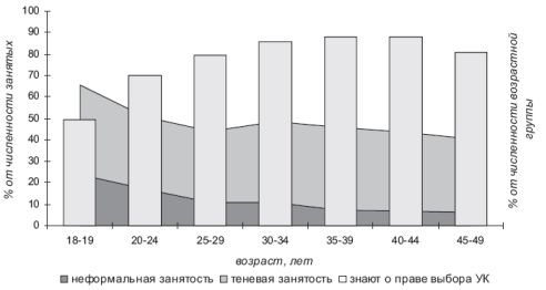 Аналогично, доля рабочих мест с устно регулируемой заработной платой ниже на государственных предприятиях и убывает по мере увеличения размера предприятия, хотя численный порог здесь выше: на средних предприятиях теневые отношения в сфере оплаты труда еще весьма распространены. Следует отметить, что старшие возрастные группы относительно реже оказываются в составе неформальной или теневой занятости (см. рис.3.2), что говорит о том, что они лучше информированы о сути пенсионной реформы и проявляют больший интерес к своей будущей пенсии.