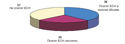 Таким образом, если взять всех не-пенсионеров - трудоспособных и пенсионных возрастов - за 100%, то совсем не платят ЕСН (по причине занятости в армии, МВД и пр., или нелегальной занятости) 32%, платят его хотя бы с части своей зарплаты - 27% и, наконец, скорее всего, уплачивают налог со всего заработка - 41%. Основной контингент плательщиков находится при этом в возрастах 40 лет и старше. В целом по нашим оценкам доля вероятных плательщиков ЕСН составляет 63%, в том числе 38% - тех, кто не имеет устных договоренностей об оплате труда, то есть платят ЕСН в полном объеме (см. рис.3.3).