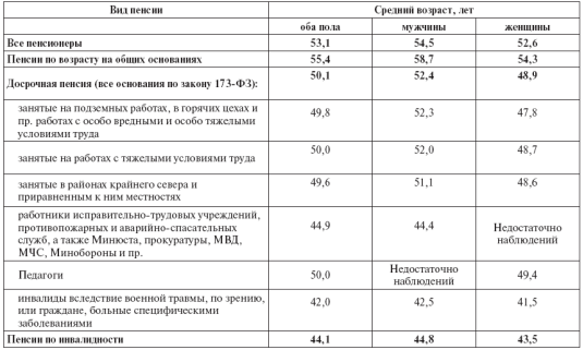 Средний возраст назначения пенсии в зависимости от ее основания,
