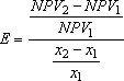 где x1 – базовое значение варьируемого параметра, x2 – измененное значение варьируемого параметра, NPV1 – значение результирующего показателя для базового варианта, NPV2 – значение результирующего показателя при изменении параметра.