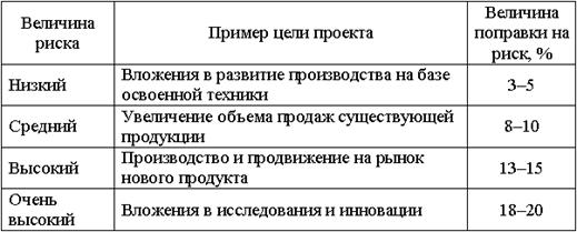 При этом если отсутствуют специальные соображения относительно рисков инвестиционного проекта, размер этого вида поправки на риск рекомендуется ориентировочно определять в соответствии с таблицей. Однако в отдельных отраслях поправки на риск могут отличаться от указанных в этой таблице.
