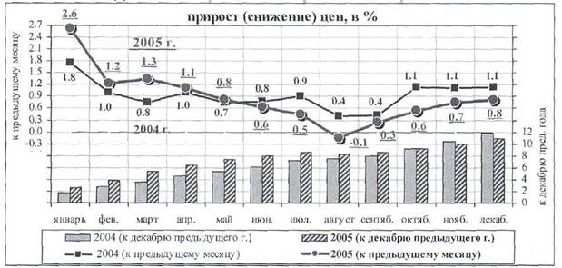 В итоге с июня 2005 г. темпы инфляции замедлились. Во II полугодии 2005 г. темпы роста цен были почти вдвое ниже по сравнению с аналогичным периодом предыдущего года (2.7% против 5.3 процента).