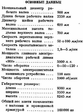Ролики приводятся во вращение индивидуальными электродвигателями через шарнирные шпиндели и установлены на самоустанавливающихся подшипниках с пружинными амортизаторами. Привод рабочей клети осуществлен через шестеренную клеть, промежуточные универсальные шпиндели и главную муфту от реверсивного электродвигателя постоянного тока мощностью 5000 л. с., О—50—120 об/мин.