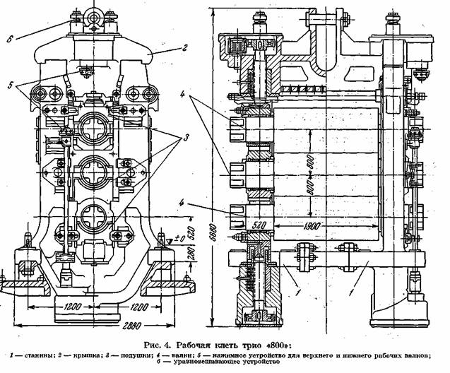 Рабочая клеть трио состоит из двух станин, крышки, комплекта подушек и валков, нажимных устройств для верхнего и нижнего рабочих валков и уравновешивающего устройства.