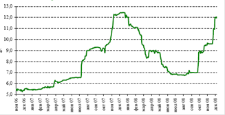 Средневзвешенная ставка по межбанковским депозитам сроком до 30 дней в 4 квартале 2008 года сложилась на уровне 5,80%. Средневзвешенная ставка по межбанковским операциям РЕПО сроком 7 дней составила 8,06% (рисунок 16).