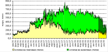 В 4 квартале 2008 года остатки на корреспондентских счетах банков в Национальном Банке снижались. За прошедший период остатки на счетах в иностранной валюте снизились значительно, тогда как остатки на счетах в национальной валюте оставались относительно стабильными (рисунок 17).