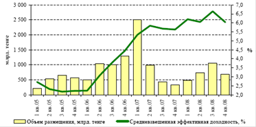 В 4 квартале 2008 года отмечалось некоторое снижение спроса со стороны банков на краткосрочные ноты Национального Банка, что связано с усилением проблемы нехватки краткосрочной ликвидности у банков. Так, объем выпущенных краткосрочных нот в октябре-декабре 2008 года снизился на 35,2% и составил 682,3 млрд. тенге. Ноты выпускались со сроками обращения 28, 91 и 182 дня, досрочного погашения нот не осуществлялось. Средневзвешенная доходность по размещаемым нотам снизилась с 6,64% в 3 квартале 2008 года до 6,04% в 4 квартале 2008 года (рисунок 20).