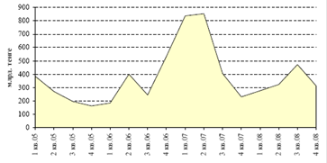 Снижение объемов привлечения депозитов от банков в 4 квартале 2008 года сопровождалось снижением объема непогашенных обязательств Национального Банка по ним в 6,3 раза до 33,0 млрд. тенге по сравнению с предыдущим кварталом (рисунок 23).