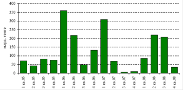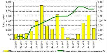 В 4 квартале 2008 года снизились объемы депозитов банков в Национальном Банке по сравнению с предыдущим кварталом, однако выросли по сравнению с показателем соответствующего периода 2007 года. Пик привлечения пришелся на октябрь. В целом, за октябрь-декабрь 2008 года было привлечено депозитов на сумму 1177,4 млрд. тенге, что в 2,2 раза меньше объема 3 квартала 2008 года и в 18,5 раза больше по сравнению с 4 кварталом 2007 года. Сроки привлечения депозитов составляли 7 дней по ставке 5,25% (рисунок 22).