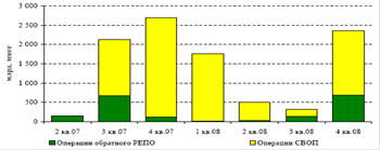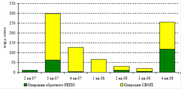 В 4 квартале 2008 года Национальный Банк предоставлял займы рефинансирования банкам посредством операций обратного РЕПО и СВОП. Общий объем операций обратного РЕПО составил 682,7 млрд. тенге, операций СВОП – 1675,1 млрд. тенге (рисунок 24).
