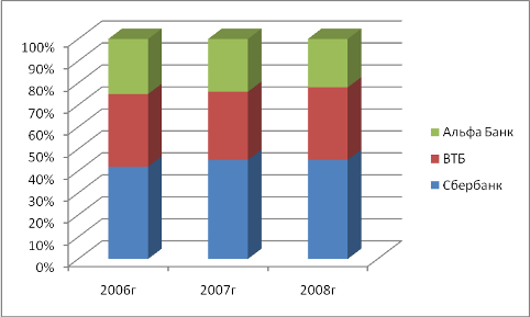 Региональный рынок кредитования юридических лиц разделили между собой лидеры. Львиная доля принадлежит Сбербанку, которая увеличивается с на протяжении всего анализируемого периода в среднем на 12%. Второе место занимает ВТБ, рост доли которого составляет 4% в среднем за анализируемый период. Альфа Банк имеет так же неплохую долю на данном сегменте кредитования, однако рост дли несущественен, и составляет в среднем 4%.