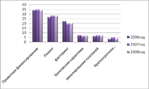 В среднем его доля ниже доли лизинга в 1,3 раза. Однако так же как и лизинг, факторинг уверенно обосновался на данном сегменте рынка, и его доля существенных изменений не имеет в рамках анализируемого периода.
