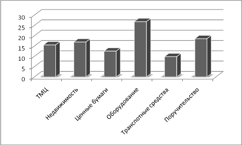 Как видно из рисунка 2.18, наибольший удельный вес в структуре видов обеспечения в среднем за анализируемый период занимает оборудование. На втором месте – поручительство и ценные бумаги Третье место в структуре видов обеспечения занимает оборудование и ТМЦ , которое на протяжении всего анализируемого периода существенно не изменялось.