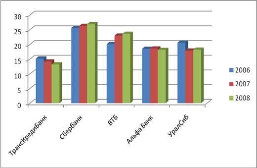 УралСиб в течение анализируемого периода увеличил свою долю, превышающую ВТБ, но потерял ее в 2007 году, сократив объемы кредитования на 10,4%, и в 2008 году так и не смог ее вернуть, увеличив ее всего на 0,5%.