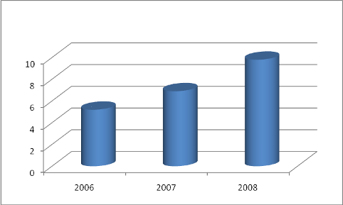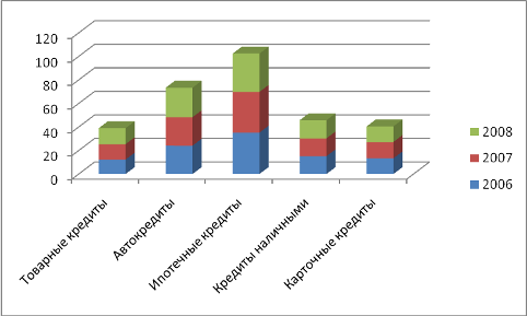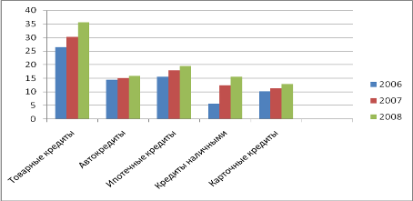 В динамике этот вид кредита имеет тенденции к роту, ежегодно увеличивающий его на 1-3%. Кредит наличными занимает третье место в данной структуре и его рост с каждым годом так же увеличивается, подтверждая рост сектора потребительского кредитования в регионе в целом. Рост объемов наличного кредитования составил в 2007 году – 12% , в 2008 году - 11%. Карточные и товарные кредиты имеют 15 и 15% доли рынка потребительского кредитования соответственно. И так же увеличивают ее с каждым годом. Так рост в среднем за анализируемый период этих кредитов составил 12 и 13% соответственно.