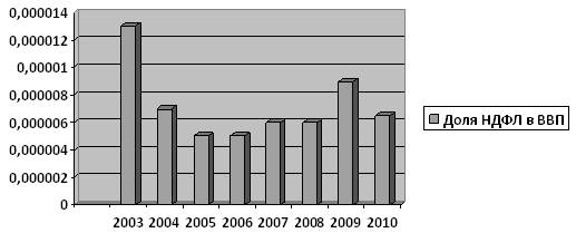 по данным Решения ГД от 18.12.2009 № 578 "О бюджете муниципального образования "город Ижевск" на 2010 год" доходы бюджета города от налога на доход физических лиц составит 2 776 314, по данным Минфина ВВП составит 42,372 трлн.руб., таким образом доля НДФЛ10 = 0,0000065%