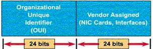 MAC-адрес состоит из двух частей – 24-разрядного уникального идентификатора организации OUI (Organizationally Unique Identifier), назначаемого Комитетом IEEE каждому производителю оборудования, и 24-разрядного номера назначаемого самим производителем для каждой