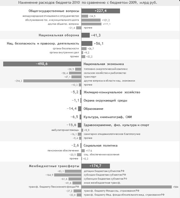 Общая картина ясна: расходы бюджета-2010 незначительно отличаются от расходов-2009. При этом в структуре бюджета-2010 значительно выросли показатели общегосударственных расходов и межбюджетных трансфертов (за счет увеличения трансфертов пенсионному фонду), а также умеренно выросли расходы на нац. оборону и нац. безопасность (+3,4% и +5,6%). При практически неизменном общем объеме расходов бюджета-2010 в сравнении с бюджетом-2009 для финансирования вышеприведенных увеличившихся расходов были значительно сокращены расходы на национальную экономику (-500 млрд, или -27%), трансферты другим бюджетам (кроме трансфертов пенсионному фонду РФ), а также умеренно (в пределах 4—9%) были сокращены другие статьи расходов: на ЖКХ, образование, здравоохранение, культуру и т. д.
