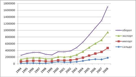 Внешнеторговый оборот РФ в 2008 году возрос на 32,1% до рекордной величины: 763, 5 млрд долл. В отличие от 2007 года наблюдалось увеличение профицита торгового баланса (на 37,3%), до 179,7 млрд долл.
