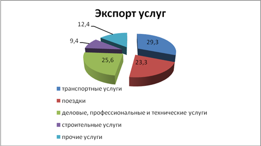 Экспорт услуг вырос с 39,4 до 51,3 млрд долл. В его составе на 3,4 млрд долл увеличилось стоимость оказанных нерезидентам деловых, профессиональных и технических услуг; на 3,2 млрд долл- транспортных услуг и на 2,3 мллрд долл- услуг по статье «поездки» .
