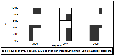Из анализа рис. 2.5. видно, что практически половину (а в 2007 больше половины) всех доходов самарской области составляют доходы, формирующиеся за счет налогов предприятий. Доля доходов бюджета, формируемых за счет налогов предприятий, возросла в 2007 году до 61 % (по сравнению с 48 % в 2006 году). В 2008 году доля таких доходов упала до 49 %. Падение доли доходов бюджета, формируемой за счет налогов предприятий может объясняться падением их прибыли, банкротством части предприятий.