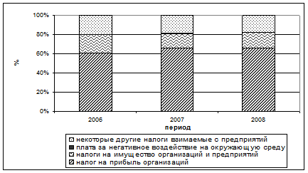 Также из приведенной выше таблицы видно, что в период с 2006 по 2008 годы доля налога на прибыль организаций в общей структуре налогов, поступающих от предприятий возросла с 61,19 % до 66,29 % (в 2006 году она составляла 61,19; в 2007 году она возросла до 66,2 %, а в 2008 - до 66,29 %). Это может свидетельствовать, прежде всего, об увеличении прибыли организаций, а, следовательно, и выплачиваемого ими налога на прибыль. Можно также заметить, что темп роста доли налога на прибыль организаций постепенно уменьшался. Такая ситуация может объясняться уменьшением темпа роста прибыли коммерческих предприятий, а также более быстрыми темпами роста других налоговых поступлений.