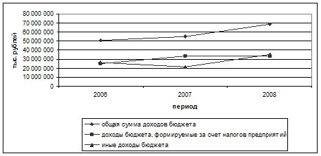 На рис. 2.4. изображен график, показывающий динамику доходов бюджета самарской области с 2006 по 2008 годы. График показывает динамику общей суммы поступающих в бюджет доходов, динамику доходов, формируемых за счет налогов предприятий, а также динамику иных доходов бюджета самарской области.