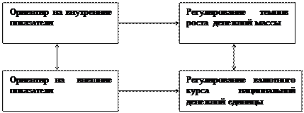 Под валютной интервенцией понимается политика купли-продажи центральным банком иностранной валюты на национальную на валютном рынке. Одним из основных принципов определения стратегии центральных банков служит ориентация на регулирование темпа роста денежной массы в национальной экономики или регулирование валютного курса национальной денежной единицы по отношению к какой-либо стабильной иностранной валюте т.е. на внутренние или внешние показатели (рис 1)[8].