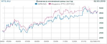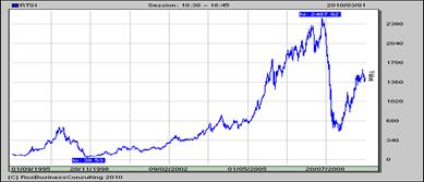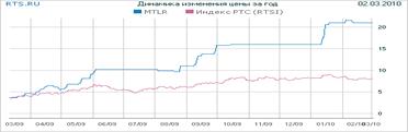 Индекс РТС - официальный индикатор Фондовой биржи «Российская Торговая Система» (РТС). Впервые был рассчитан 1 сентября 1995 года и является общепризнанным показателем состояния российского фондового рынка. Индекс РТС рассчитывается в режиме реального времени в течение всей торговой сессии биржи РТС (с 10:30 до 18:00 по московскому времени) при каждом изменении цены акции, включенной в список для его расчета. В базу индекса РТС входит 50 наиболее капитализированных и ликвидных акций (Приложение № 2). Изменение стоимости акций каждой компании влияет на величину индекса РТС. При этом, чем больше доля компании в индексе, тем ее влияние сильнее. Индекс РТС используется для того, чтобы отслеживать общее состояние рынка акций страны, вехи его развития и перспективы движения в будущем. Кроме того, индекс составляется таким образом, чтобы максимально адекватно отразить структуру экономики государства.