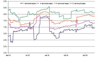 В начале второй половине 2006 г. наблюдалась стабилизация процентных ставок на текущих уровнях по векселям первого — второго эшелона и снижение в третьем. Пауза в цикле повышения учетной ставки ФРС США и возможное ослабление монетарной политики в следующем году, продолжение укрепления рубля, повышение кредитного рейтинга России, обусловленного высокими макроэкономическими показателями и досрочным погашением долга Парижскому клубу кредиторов, были в тот момент основными факторами стабилизации доходности на рублевом долговом рынке в целом и на вексельном рынке, в частности.