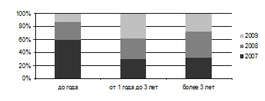 Распределение облигаций по срокам обращения представлено на графике (рис. 2.6). В 2009 году более 70 % зарегистрированных выпусков облигаций имеют срок обращения от 1 года до 3 лет.