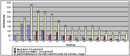 Информация о выдаче и аннулировании лицензий, а также об изменении количества действующих профучастников по годам представлена на графике (рис. 2.7).