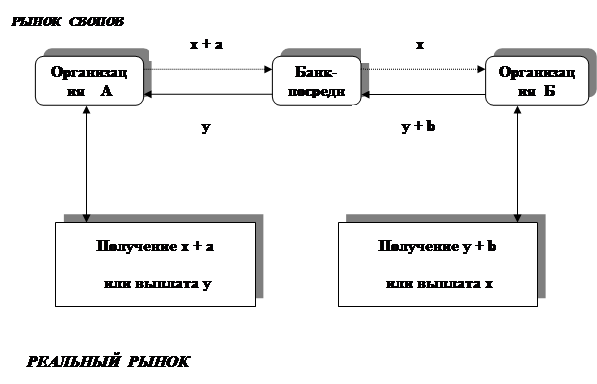 Сторона Б заключает с банком своповый контракт, согласно которому она должна перечислить ему денежную сумму «у+b», а банк должен перечислить стороне А денежную сумму «x». Сальдовый платеж составляет «x–(y+b)» и перечисляется стороне А, если он больше нуля, или перечисляется банку, если он меньше нуля.