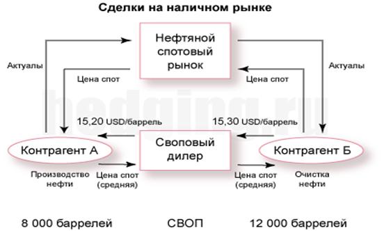 Например: когда производитель сырой нефти (контрагент А) хочет зафиксировать на пять лет цену, которую он получает за свой товар, причем месячная производительность составляет 8000 баррелей. В то же время контрагент В который занимается очисткой нефти и производством химических продуктов, хочет зафиксировать на пять лет цену, которую он платит за нефть, — его месячная потребность в нефти составляет 12 000 баррелей. Чтобы достичь желаемых результатов, контрагенты заключают контракты «своп» (каждый свой) со своповым дилером, но свои сделки в актуалах осуществляют на наличных рынках.