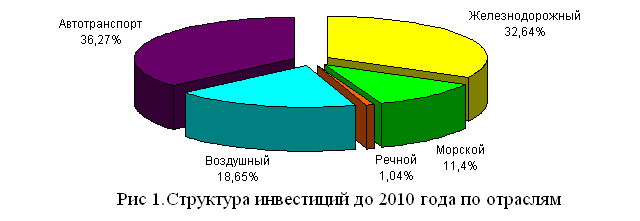 На период до 2010 г. минимальные объемы инвестирования в развитие транспортной отрасли оцениваются в 19,3 млрд долл., в частности на подвижный состав — 7,74 млрд долл., на транспортную инфраструктуру — 11,56 млрд долл. Доля железнодорожного транспорта оценивается в 6,3 млрд долл., морского — 2,2 млрд, речного — 0,2 млрд, воздушного — 3,6 млрд, автотранспорта — 7 млрд долл.(рис.1)