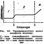 Технология переработки пластмасс в нзде-лия учитывает зависимость деформации от температуры и физическое состояние полимера. Эти зависимости носят название термомеханических кривых. На рис, 424 приведена типичная термомеханическая кривая для аморфного полимера.