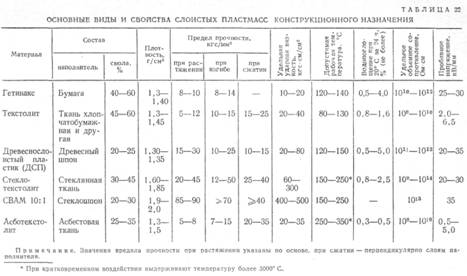 Слоистые пластмассы —материалы, армированные параллельно расположенными слоями листового наполнителя: бумаги, ткани и т. п. (табл. 22).