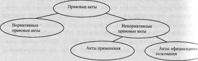 Акты официального толкования – это официальные юридические акты, разъясняющие действительный смысл и значение нормы права и действующие в единстве с самой этой нормой. Иными словами, это такие акты, в которых дается официально разъяснение действующих правовых норм, но новые нормы не устанавливаются. К актам толкования можно отнести решения Конституционного Суда РФ, руководящие разъяснения Пленума Верховного Суда РФ, Пленума Высшего Арбитражного Суда РФ и др. Таким образом, подводя итог рассмотренным правовым актам можно сказать, что правовые акты подразделятся на нормативные и ненормативные правовые акты, а ненормативные правовые акты разделяются на акты применения и акты официального трактования, Распределение правовых актов наглядно видно из схемы, приведенной на рис 1.