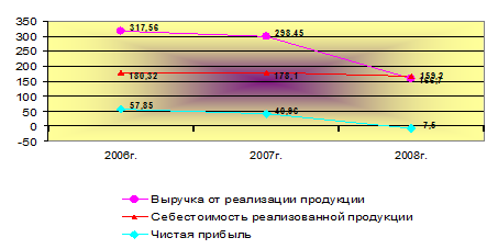 По данным таблицы можно сделать вывод, что выручка от реализации продукции в период 2006г. 2008г. имела отрицательную тенденцию, так в сравнении с 2006г. общий объем выручки снизился на 158,36 тыс. грн. или на 49,87%, что в результате привело не только к снижению прибыли, но и к реальным убыткам в размере 7,5 тыс. грн. Таким образом, относительно 2006г. эта разница составила 65,35 грн. или 112,96% с отрицательным значением. При этом себестоимость реализованной продукции снизилась с разницей 13,62 тыс. грн. или 7,55%.