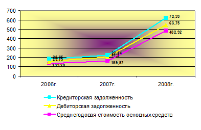 При этом среднегодовая стоимость основных средств в анализируемом периоде увеличилась более чем в 2,5 раза: разница между 2006г. и 2008г. составила 349,64 тыс. грн. или 269,335%. Положительная тенденция в отношении к 2008г. также имела место в изменении дебиторской и кредиторской задолженности – 40 тыс. грн.(168,42%) и 49,28тыс. грн. (208,37%) соответственно.