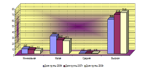 Их доля составила в 2008г. 62,22% и увеличилась по сравнению с 2006г. на 45,05%, а в сравнении с 2007г. на 41,62%; соответственно и изменилось отношение труднореализуемых активов и легкореализуемых.