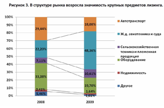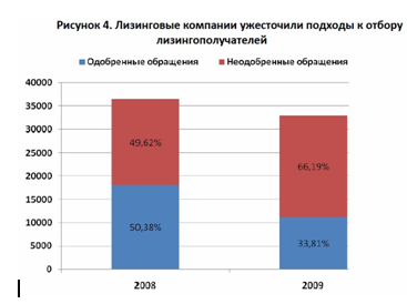 Сократился не только бизнес. Можно констатировать спад спроса на услуги лизинга. В 2009 году число обращений в лизинговые компании уменьшилось на 9,4%. Число одобренных обращений упало на 38,2%.[24]
