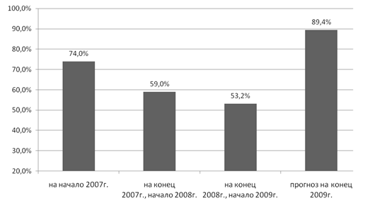 Согласно таблице 11 и рисунку 7 величина рентабельности собственного капитала возросла на 36 процентных пунктов относительно показателя на конец 2008 года. Такой скачок обусловлен увеличением коэффициента оборачиваемости активов, возросшего в 1,7 раз. Причиной же увеличения коэффициента оборачиваемости активов стало проведение операции факторинга и последующее введение кредитной политики, предложенной в главе 2.