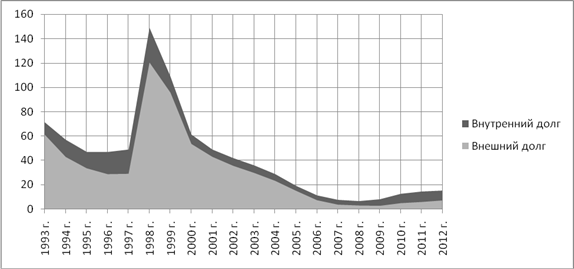 Рис. 3. Динамика структуры государственного долга РФ за период 1993-2012 гг.[44]* (% ВВП). *С 2005 года посчитано по данным Банка России и Минфина РФ